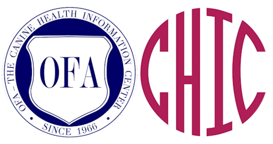 These are the symbols that indicate that you can look up our breeding dogs in the OFA Canine Health Information Center’s database. For a dog to receive and OFA logo, it means that one or more DNA tests and veterinarian exams for that breed have been completed on the dog.  If the dog has had ALL of the recommended testing and evaluations recommended by the AKC Breed parents clubs and submitted, they are provided with a CHIC number.